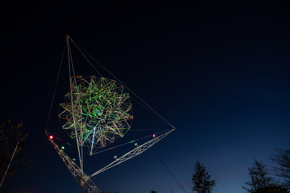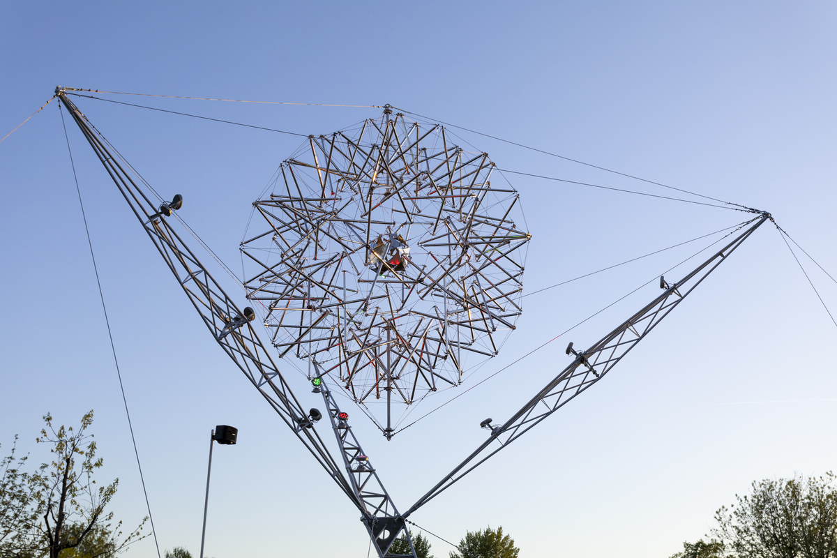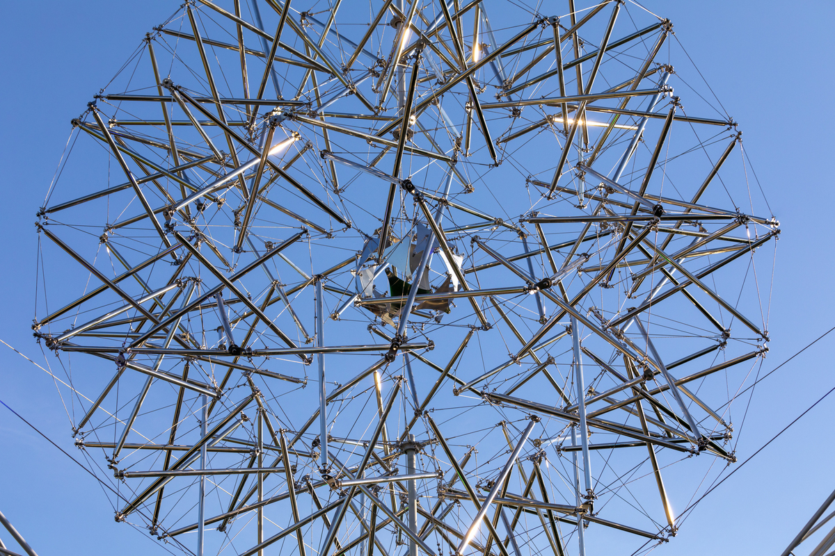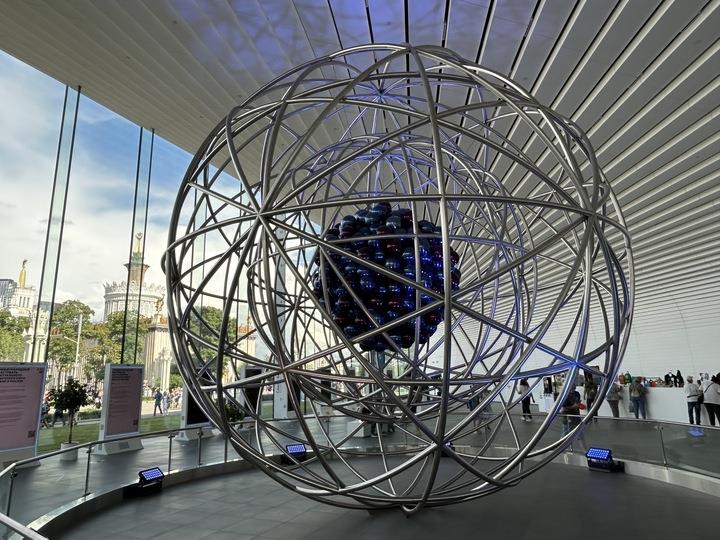 Инсталляция в виде символической модели атома представляла собой большую динамическую сферу из сотен металлических трубок. Трубки блестели на солнце днем и отражали световые проекции ночью. Вся конструкция держалась исключительно за счет самонапряжения составных частей и свободно двигалась под порывами ветра.