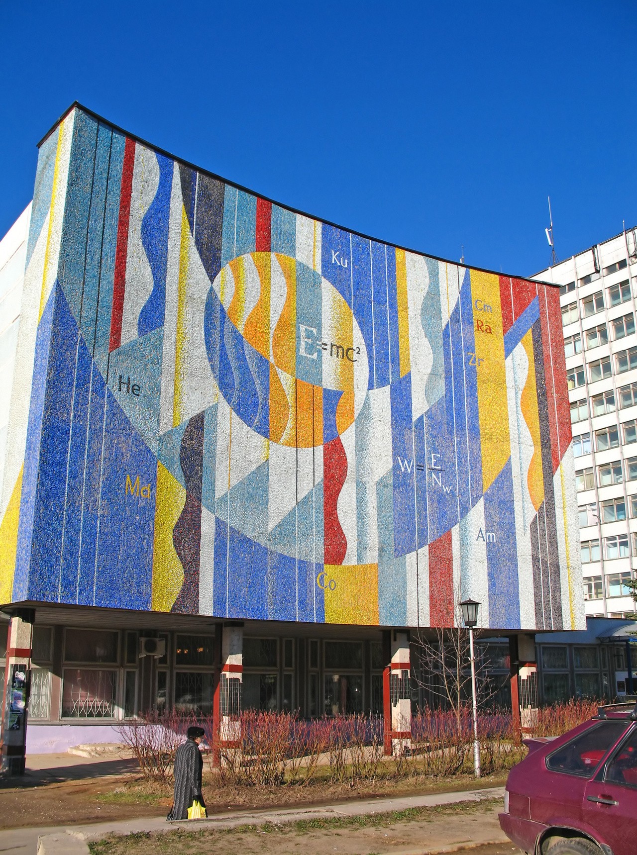 В центре композиции — основополагающая формула E = mc². Вокруг нее — элементы таблицы Менделеева. Автор композиции — художник Андрей Кузнецов, посвятивший ядерной энергетике еще ряд работ, в том числе стелу «Атом для мира» на въезде в другой важнейший советский наукоград — Дубну.
