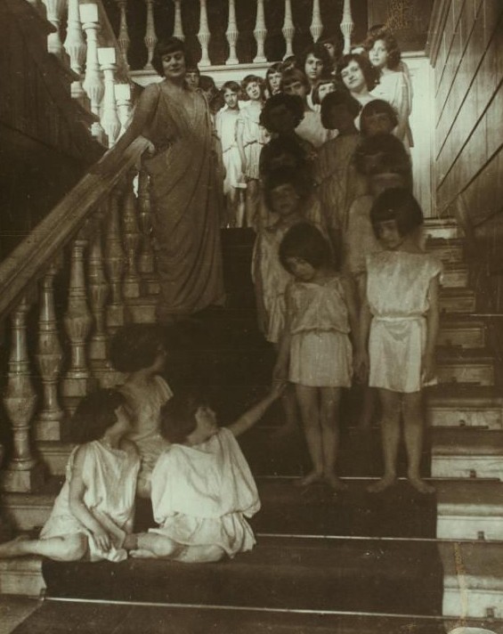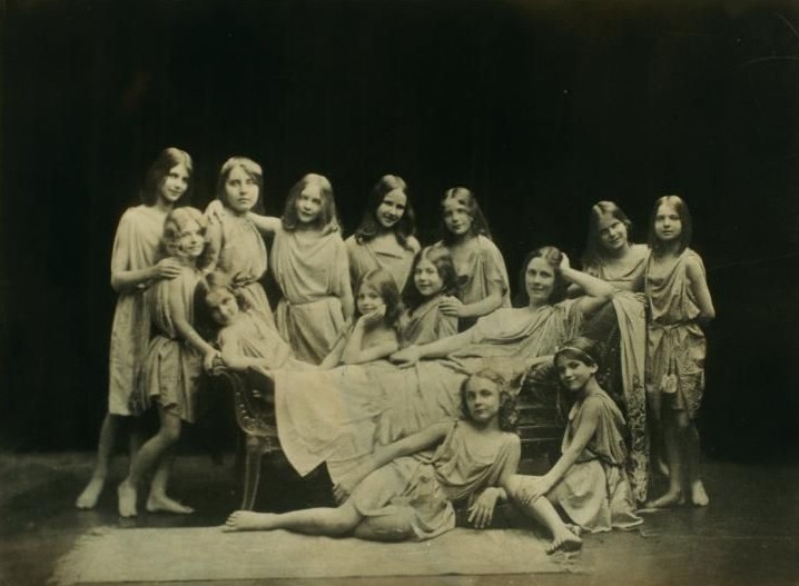 В 1904 году сестры Дункан открыли школу-пансион в дачном пригороде Берлина. Повседневными делами и преподаванием занималась Элизабет, а художественными — Айседора. Она бывала в школе наездами, но пользовалась неизменной любовью учениц и служила им идеалом для подражания. Во время своих кратких приездов она танцевала вместе с ученицами. На этом фото, композиция которого восходит к античным изображениям, Дункан возлежит в окружении одиннадцати девочек. Когда они подрастут и научатся танцевать так же хорошо, как она сама, их назовут The Isadorable. В этом названии, придуманном французским поэтом Фернаном Дивуаром, соединяются имя Isadora и слово adorable, что значит «обожаемый». Четверо из учениц — Анна, Ирма, Лиза и Мария-Тереза — сами станут преподавать танец Дункан.