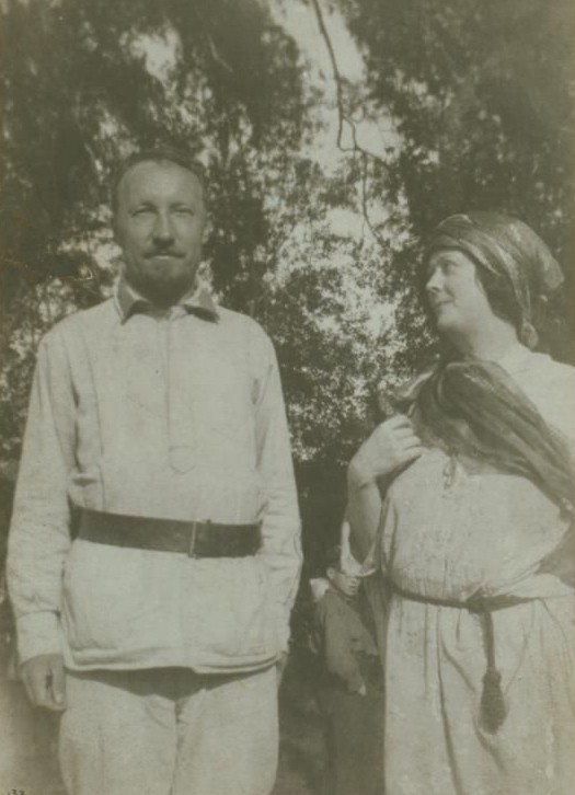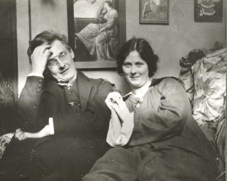 На этом снимке Дункан с отцом ее первого ребенка, Эдвардом Гордоном Крэгом. Крэг был сыном английской актрисы Эллен Терри (скорее всего, это ее портрет висит на стене) и прославился как новатор театра. Он был художником, режиссером и теоретиком, и его идеи часто казались парадоксальными. Например, он утверждал, что кукла — наилучший актер, поскольку не нагружена психологией и подчиняется лишь природным законам, и что человек-актер должен ей подражать, стремиться стать «сверхмарионеткой». Интересно, что эту идею Крэг сформулировал будучи спутником Айседоры; свою статью «Актер и сверхмарионетка» он написал вскоре после манифеста Дункан «Танец будущего» (1903).