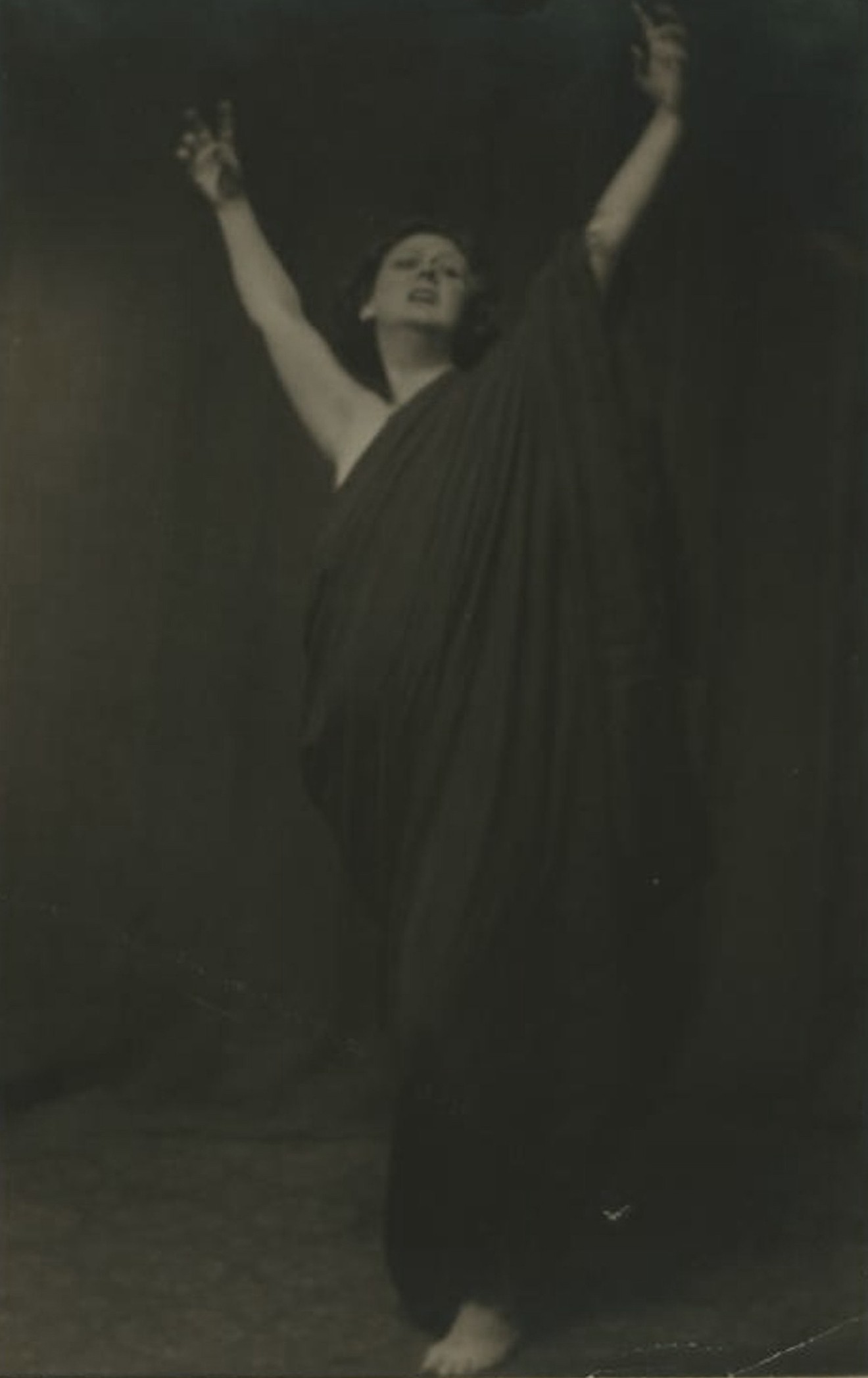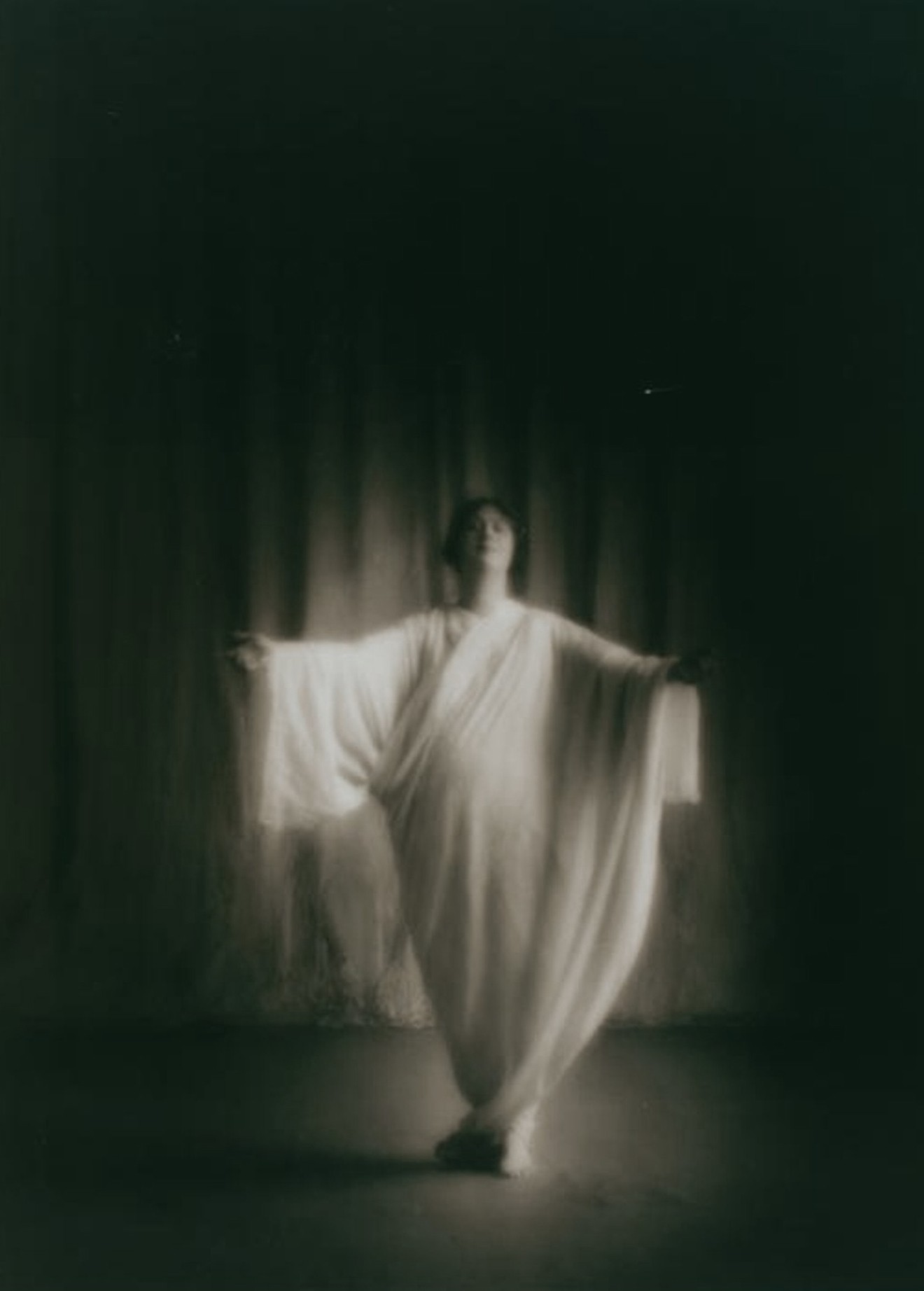 Как и предыдущее, это фото снято в студии фотографа Арнольда Генте между 1915 и 1918 годом. Айседора часто использовала движения и позы, цитирующие известные образы. Для одной из ранних своих программ, «Танцевальные идиллии», она поставила танец по мотивам «Весны» Боттичелли, иллюстрировала древнегреческие мифы о Нарциссе, о Пане и Эхо, Орфее и Эвридике, изображала вакханок и дриад, танцевала рубаи Омара Хайяма и воплощала иконические образы ангелов и жриц в позах с открытыми для объятия или воздетыми к небу руками.