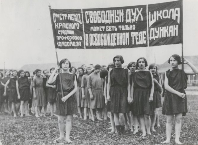 На этом снимке ученицы московской школы Дункан участвуют в субботнике на строительстве Красного стадиона. Стадион возводился на Воробьевых горах по инициативе Подвойского как площадка для спортивных выступлений и народных праздников. В проводимых здесь массовых мероприятиях участвовала и школа Дункан. За одно лето 1924 года ее ученицы, уже подросшие, сами обучили танцу и пластике полтысячи детей. Школа просуществовала до 1949 года. А в 1990-е годы ее бывшие ученицы помогали воссоздать ранний танец модерн в постсоветской России.