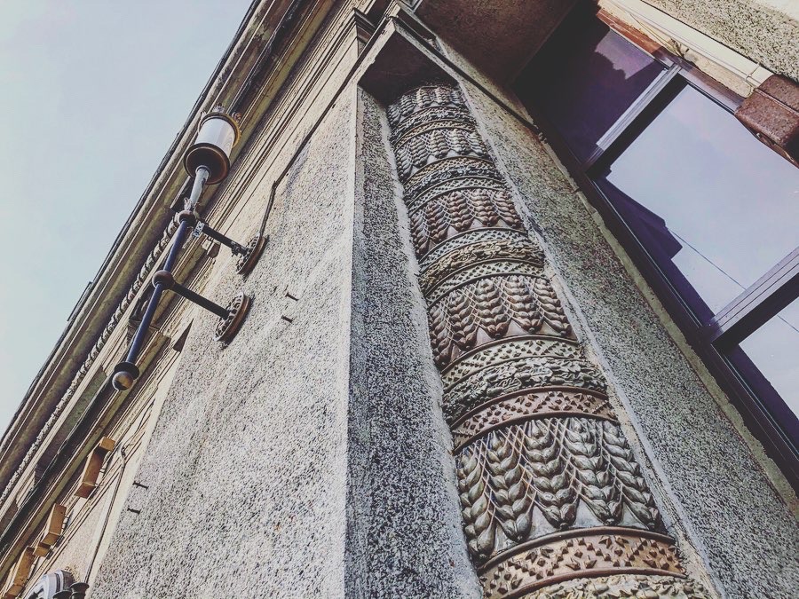 Фабрику‑кухню легко не заметить, хотя она и находится в самом туристическом месте города, в двух шагах от площади Независимости. Небольшое здание, собранное из различных геометрических объемов в единую динамичную композицию, с центрального ракурса напоминает летящий вперед паровоз — идея технологичности и движения вперед типична для эпохи авангарда. После недавней реставрации на фасады вернулась характерная мелкая расстекловка, которая особенно эффектно смотрится на полуцилиндрическом центральном объеме, причем при взгляде как снаружи, так и изнутри. Поднимаясь по внутренней лестнице, обратите внимание на выступающие потолочные ригели Ригель — несущий элемент (балка, стержень) строительной конструкции, как правило горизонтальный. Он может быть сделан из металла, железобетона или дерева, соединяет вертикальные элементы (стойки, колонны) и служит опорой для прогонов и плит, устанавливаемых в перекрытиях или покрытиях зданий. — вместе с несущими колоннами‑опорами они принимают почти скульптурную форму.