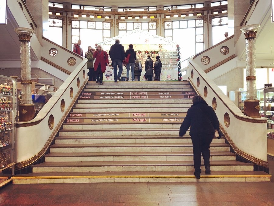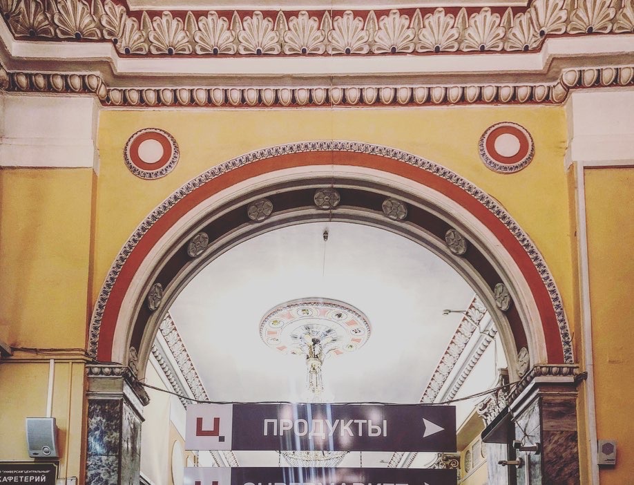 Здание универмага решено с основательностью классического памятника: вход оформлен тремя высокими арками; трехчастная схема повторяется в решении оконных проемов; карнизы и горизонтальные тяги пропорционируют многоэтажный объем, повторяя трехуровневую схему ренессансного палаццо; все декоративные акценты представляют собой интерпретацию ордерных элементов; богатый репертуар пластических деталей подчинен симметрии; образ усиливает крупный масштаб и благородный серый оттенок камня. На главном фасаде дисциплинировано разложены разорванные лучковые и треугольные фронтоны и фронтончики, пилястры и пилястрочки, гирлянды, керамические панно, факельные светильники. Но это разнообразие кажется сурово лаконичным по сравнению с той палитрой приемов, которые авторы используют в отделке интерьеров. Сложности и качеству работ позавидовали бы последователи движения «Искусства и ремесла» «Искусства и ремесла» — английское художественное движение Викторианской эпохи (конец XIX века), участники которого следовали идеям Джона Рёскина и Уильяма Морриса о художественном превосходстве изделий ручного труда над продуктами промышленного производства.: красочные майоликовые рельефы, гравированное национальными орнаментами стекло, «хрустальные» колонны с подсветкой, фонари в форме спиральных колонн, украшенные бриллиантовым рустом пилоны, рожь и васильки, аканты и звезды, шелк и бронза, мрамор и полированный дуб.