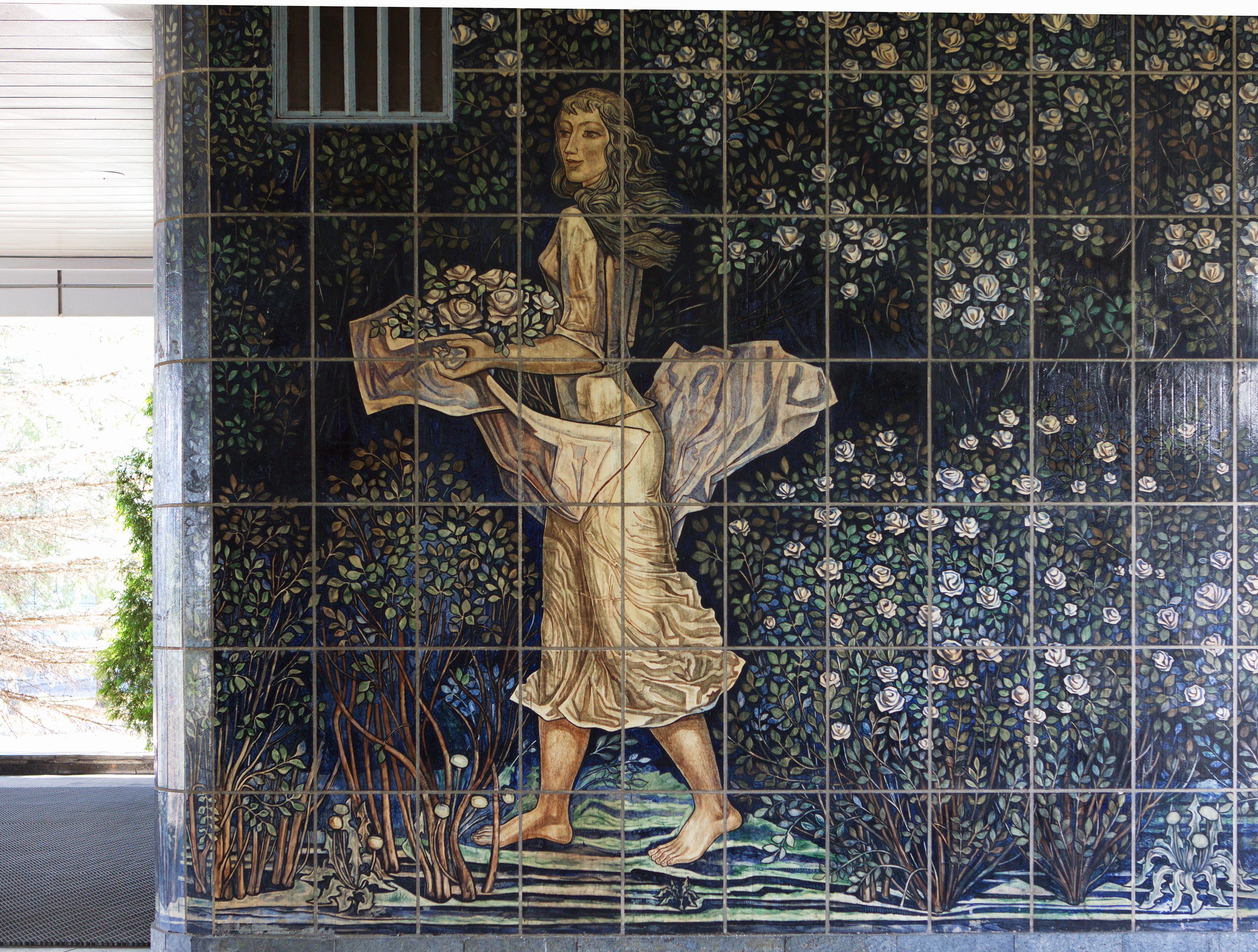 Во внутреннем дворе гостиницы есть керамическое панно Евгения Кузнецова (он же автор перекрашенного в синий цвет рельефа на фасаде здания). Панно называется «Садовницы» (или «Девушки с цветами»), техника — подглазурная роспись. Где‑то с середины 1970‑х годов в монументальную живопись приходит романтизм и увлечение ретроспективизмом. Суровые герои настоящего остались в прошлом, вместо них появились романтические девушки и исторические персоны. Это было приметой времени и визуальным заявлением о собственной истории. Девушки с цветами как будто встречают гостей. Советская художественная критика обвиняла Кузнецова в подражании Боттичелли, отходе от советского искусства. Художник увлекался Возрождением и заслуженно считается одним из самых тонких белорусских лирических мастеров.