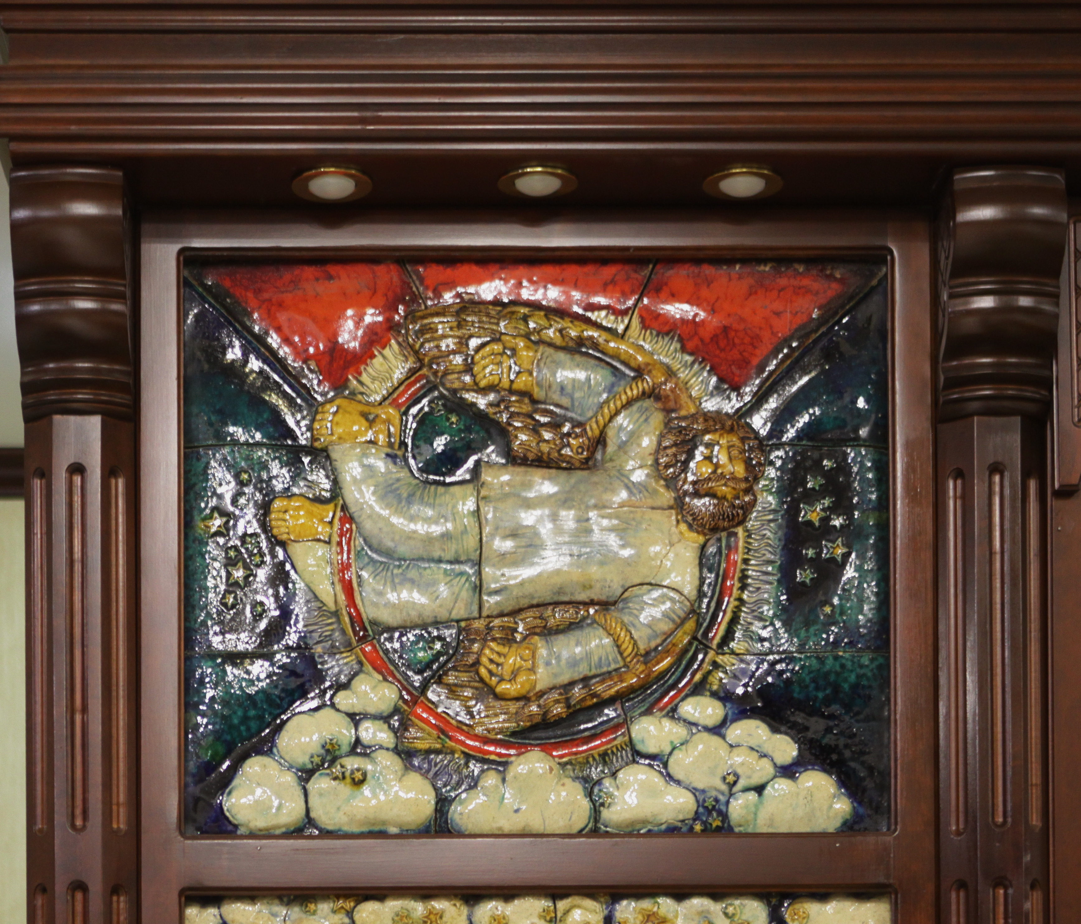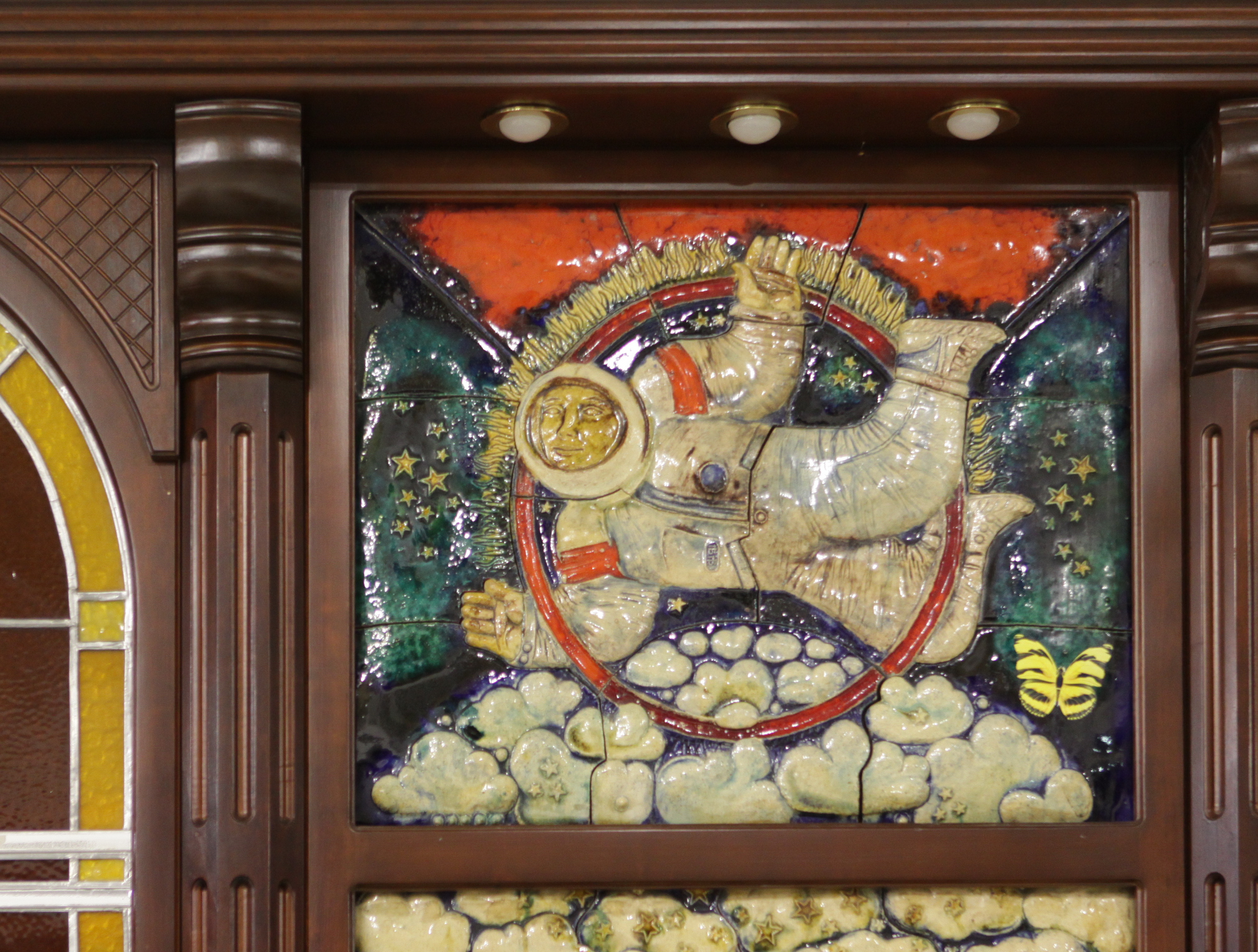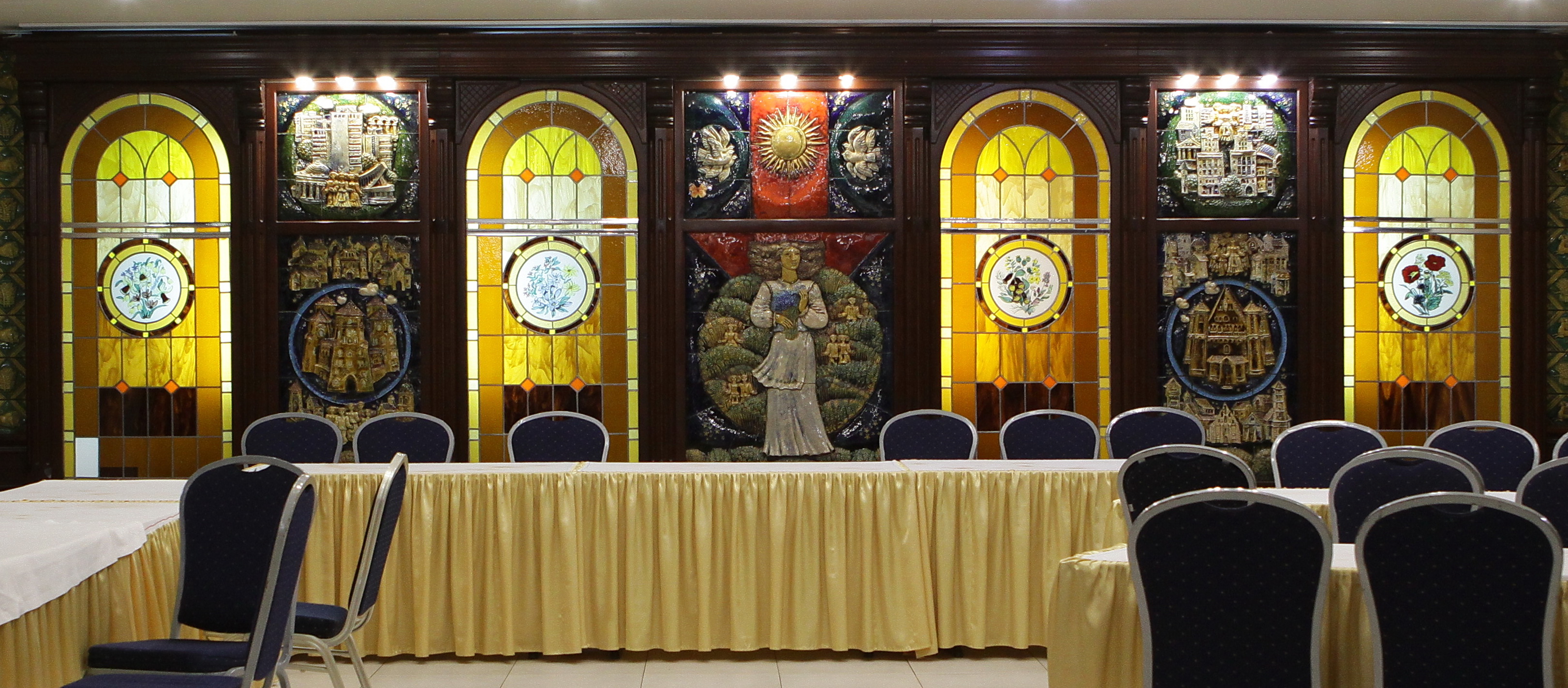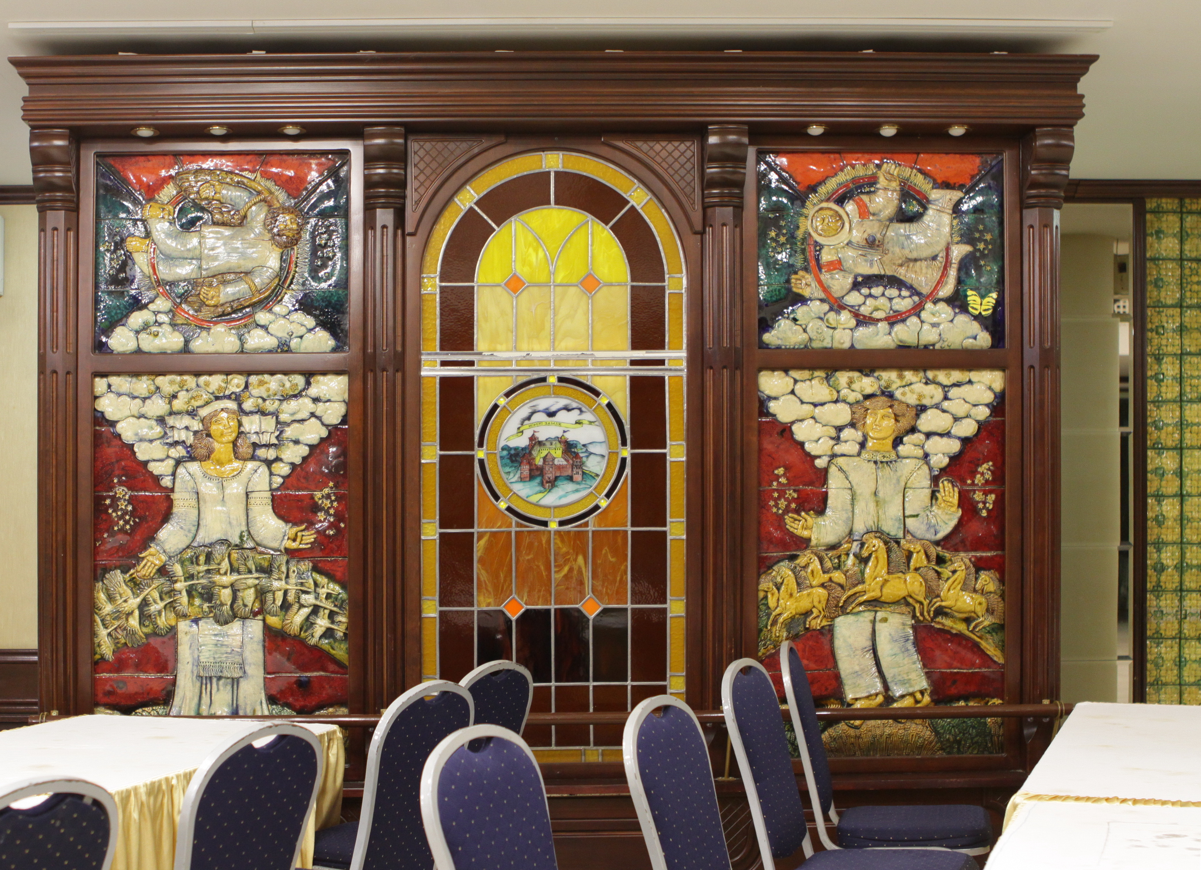 Ресторанный зал гостиницы оформляли Николай Байрачный и Валерий Приешкин. С Байрачного, Приешкина и Александры Дятловой (художница также принимала участие в оформлении гостиницы) началась новая история белорусской керамики. Все трое работали на комбинате декоративно-прикладного искусства в Борисове, приблизительно в 70 километрах от Минска, а значит, вдалеке от непосредственного контроля. В Борисов керамистов определил тогдашний председатель Республиканского совета по монументальному искусству Михаил Савицкий. На комбинате оказались подходящие условия и понимающее начальство. Байрачный и Приешкин, по их собственным словам, хотели показать иностранным гостям самое лучшее, что есть в стране. Техника была выбрана неслучайно — это отсылка к поливной керамике Степана Полубеса Степан Иванов (Полубес) — изразцовых дел мастер. Уроженец Мстиславля, в середине XVII века он попал в Москву как пленник после войны с Речью Посполитой. Известен по работам в Иосифо‑Волоколамском, Новоиерусалимском, Солотчинском монастырях. и намек на то, что в каждом городе с Магдебургским правом Магдебургское право — право на независимость города от феодалов, сложившееся в XIII веке в немецком городе Магдебург. Получивший такую привилегию город представлял собой самостоятельную административную единицу со своими атрибутами — территорией, гражданством, властными и судебными институтами, гербом, налоговой системой. были свои большие гончарные мастерские. Мало кто верил, что молодые мастера справятся с задачей. В итоге результат понравился, и художникам увеличили гонорар, кстати, по требованию Александра Кищенко. Стены зала почти полностью закрыты керамикой: здесь есть изразцы с дубовыми листьями, изображения церкви Святого Михаила в поселке Сынковичи, Борисоглебской (Коложской) церкви в Гродно, современная архитектура Минска, на соседних панно летают космонавт и народный умелец с крыльями.
