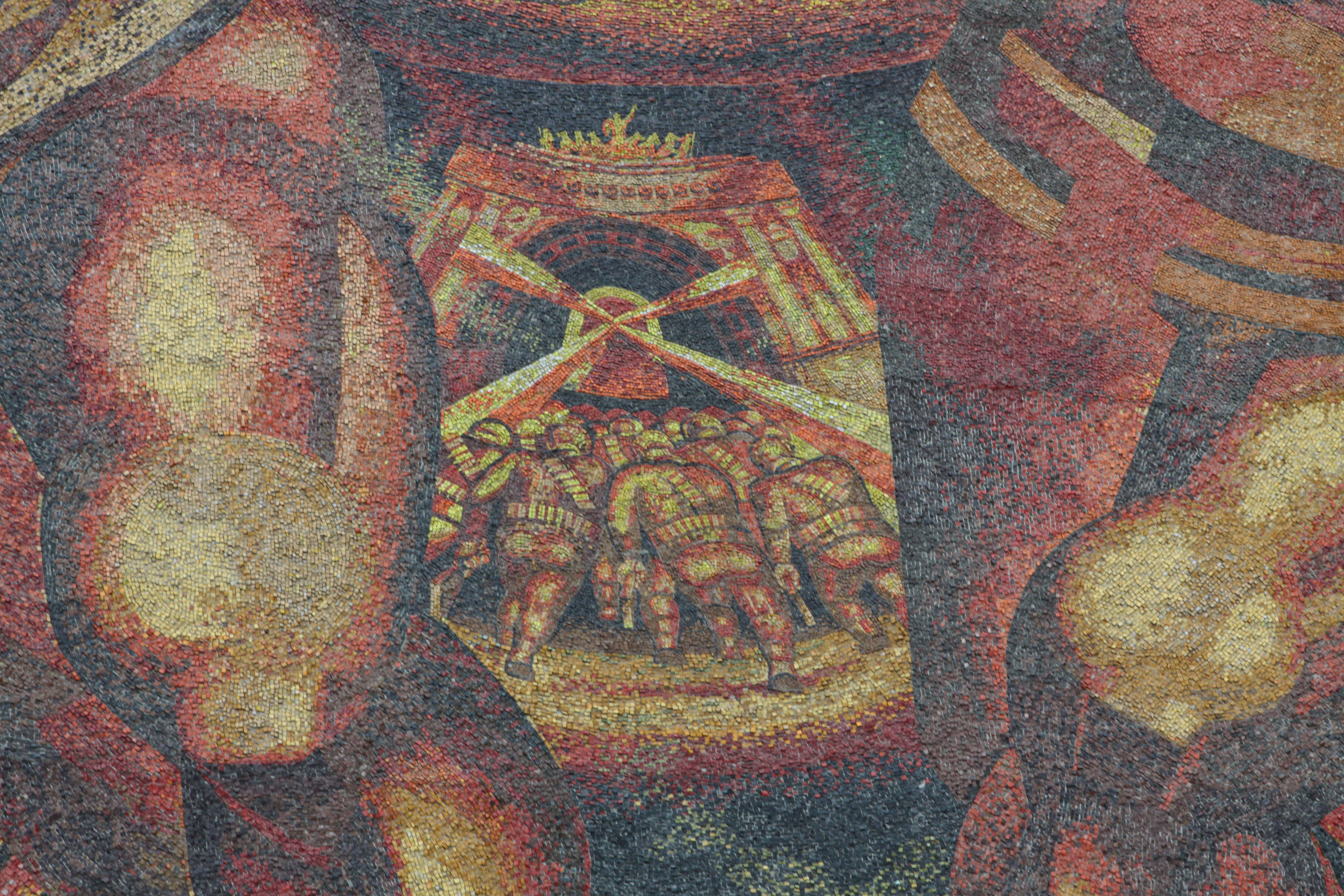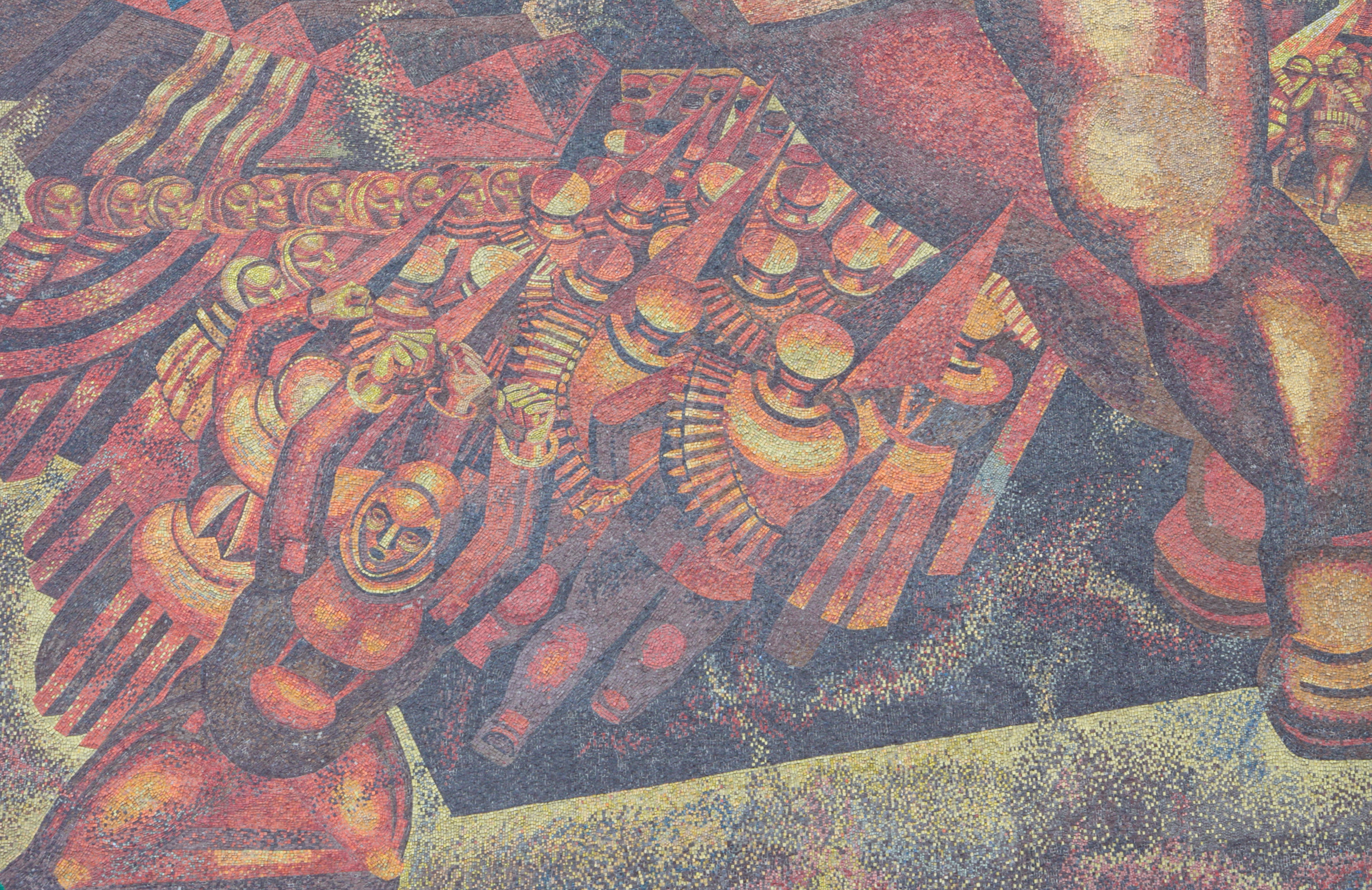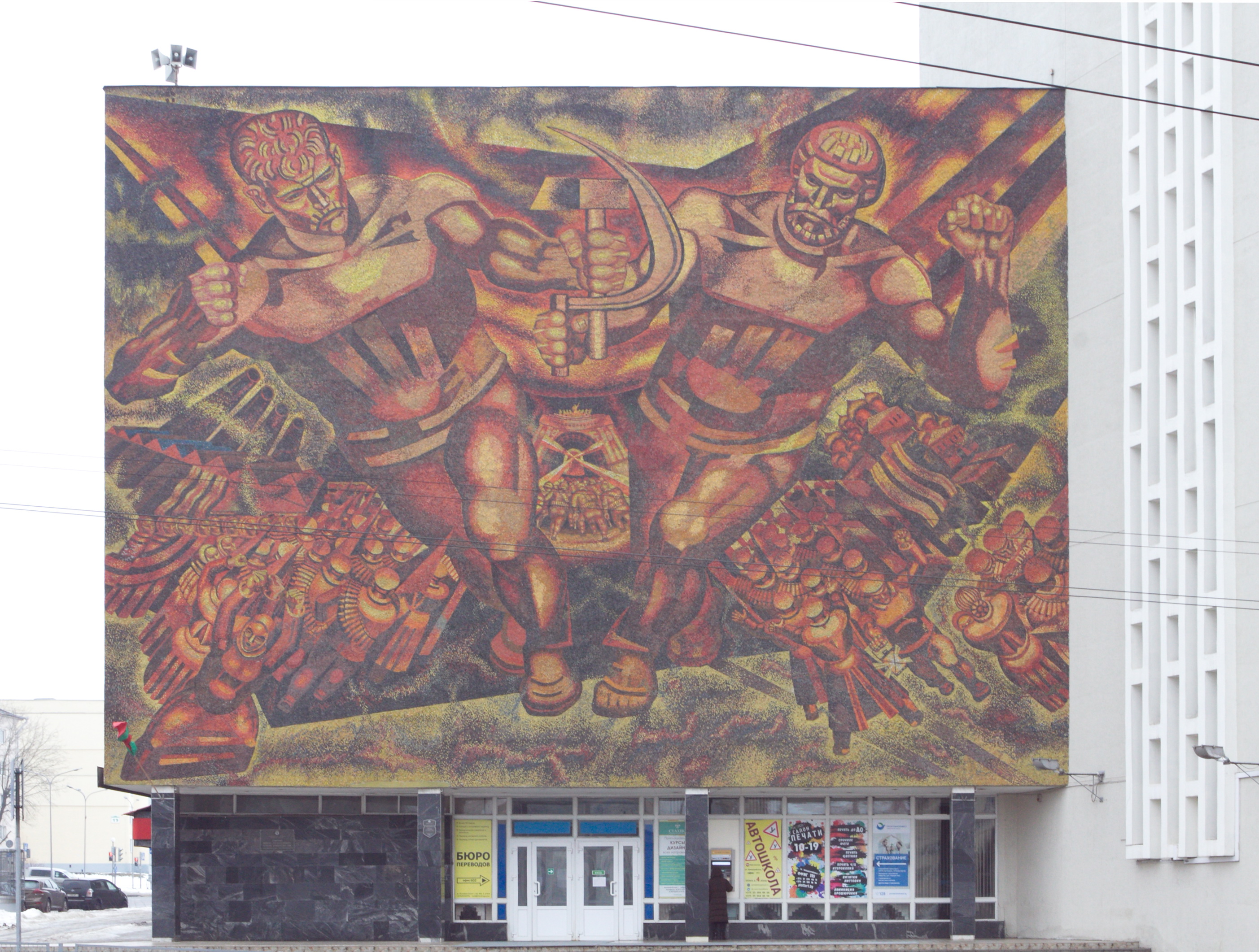 Знакомство с монументальной живописью Минска можно начать с микрорайона Восток‑1 — северо‑восточного парадного въезда в город Другой известный парадный въезд — это так называемые «Ворота Минска» на Привокзальной площади, которые представляют собой ансамбль из двух симметрично стоящих жилых домов с башнями и скульптурами, возведенный в 1953 году (архитектор Борис Рубаненко, скульпторы Андрей Заспицкий, Виктор Завадский и Сергей Логвин).. Окончательный вариант застройки микрорайона Восток‑1 появился в 1967 году, с бурным ростом населения города Население Минска начинает бурно расти с конца 1950‑х годов. Всего за период с конца 1950‑х по конец 1980‑х количество жителей увеличилось в 3 раза, с 500 тыс. до 1,5 млн. С начала 1960‑х годов город активно развивался в северо‑восточном направлении.. К этому времени на базе типовых серий научились собирать разные конфигурации домов, изменилось и пространственное планирование. Восток стал последним микрорайоном, построенным как единый архитектурный ансамбль, и первым в стране с парадным монументальным оформлением В Беларуси есть еще два города с аналогичным оформлением, однако мозаики в Бобруйске меньше и скромнее, а панно в Новополоцке были закрыты во время ремонта..