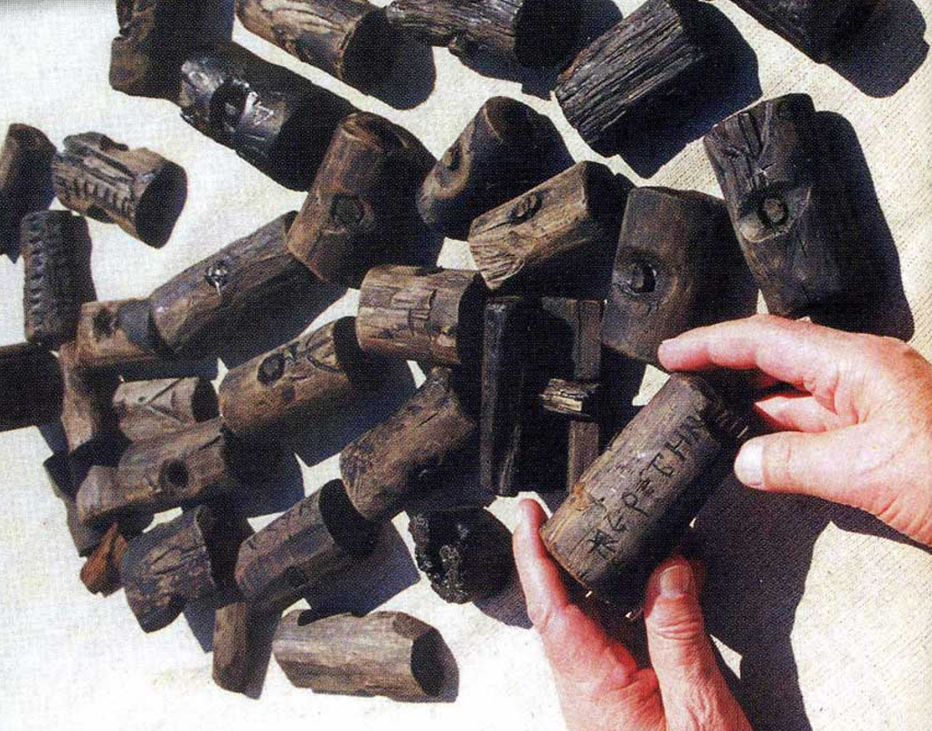 Это знаменитые новгородские цилиндры, деревянные бирки, служившие замками на мешках с данью — пушниной. Они были найдены в 1999 году на Троицком раскопе в слоях середины XI — начала XII века. На фото в руках Валентина Лаврентьевича Янина цилиндр, на котором написано «жеребийное». Так что, возможно, и обсуждаемая берестяная грамота сопровождала такой же «жеребийный» мешок с данью, собранной по жребиям.
