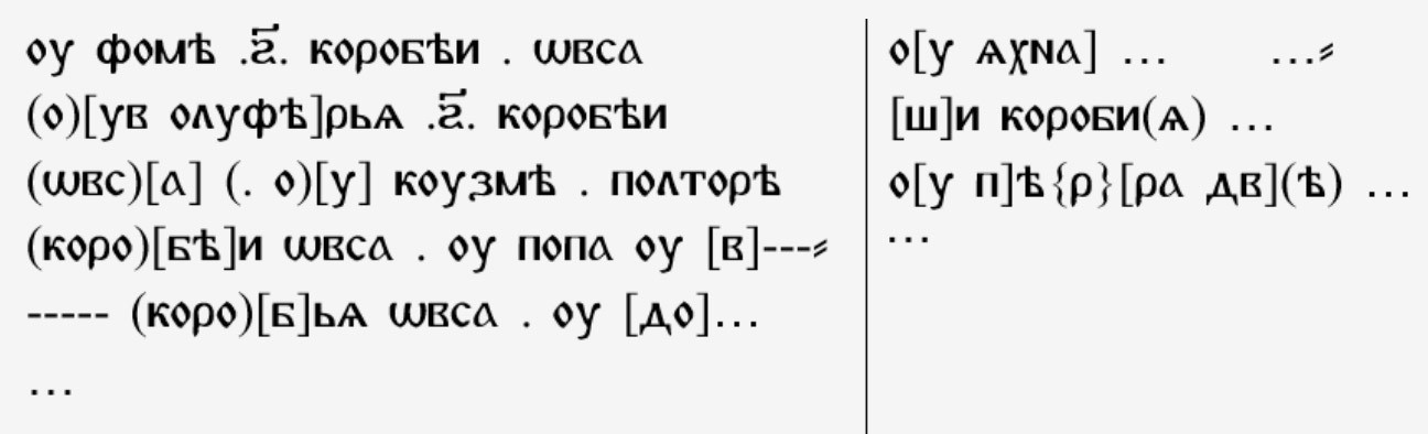 Лакуны на концах первой и второй строк легко заполняются. Получаем фразу, которая в стандартной орфографии была бы написана так (начальное «от» выписано по ошибке: автор, вероятно, решил начать со стандартной адресной формулы «от
