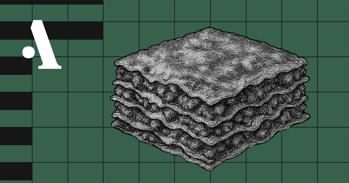 - Полностью покрыть листами теста для лазаньи, сверху — слой рагу, слой соуса бешамель.